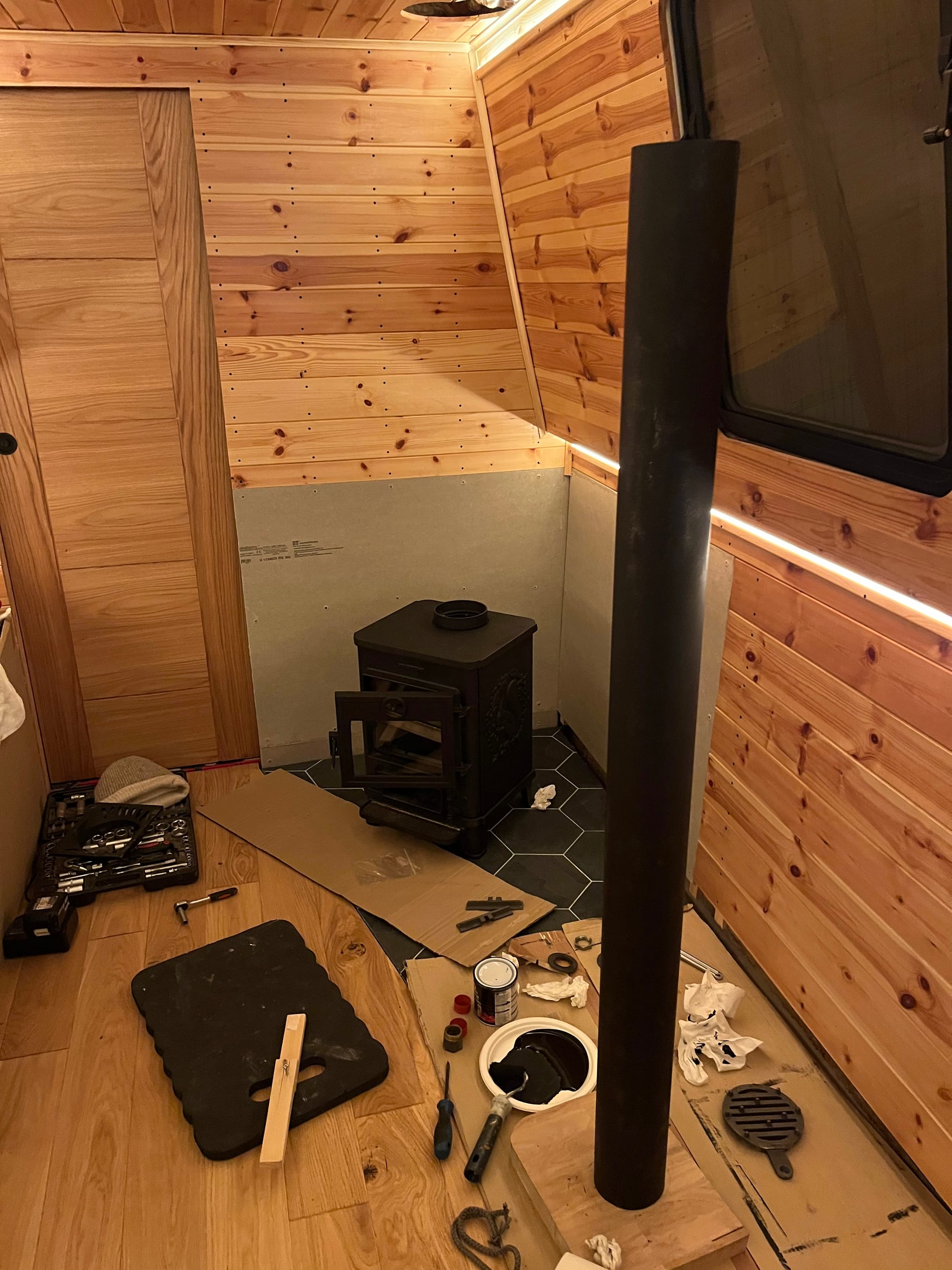 And then fit the chimney, wedging in fire rope and high-temp silicone (~300°) for the roof collar. It oddly smells exactly like vinegar...
