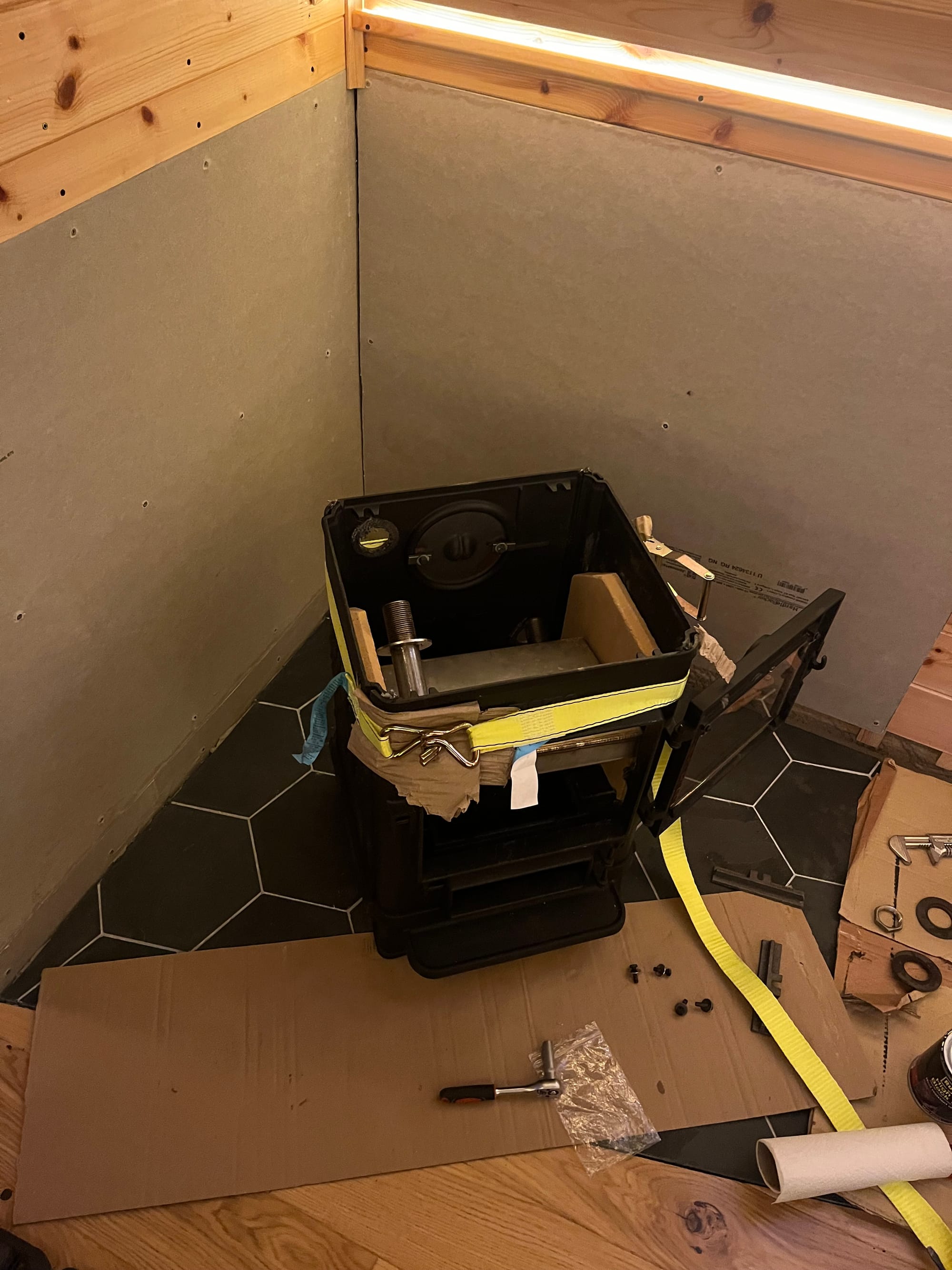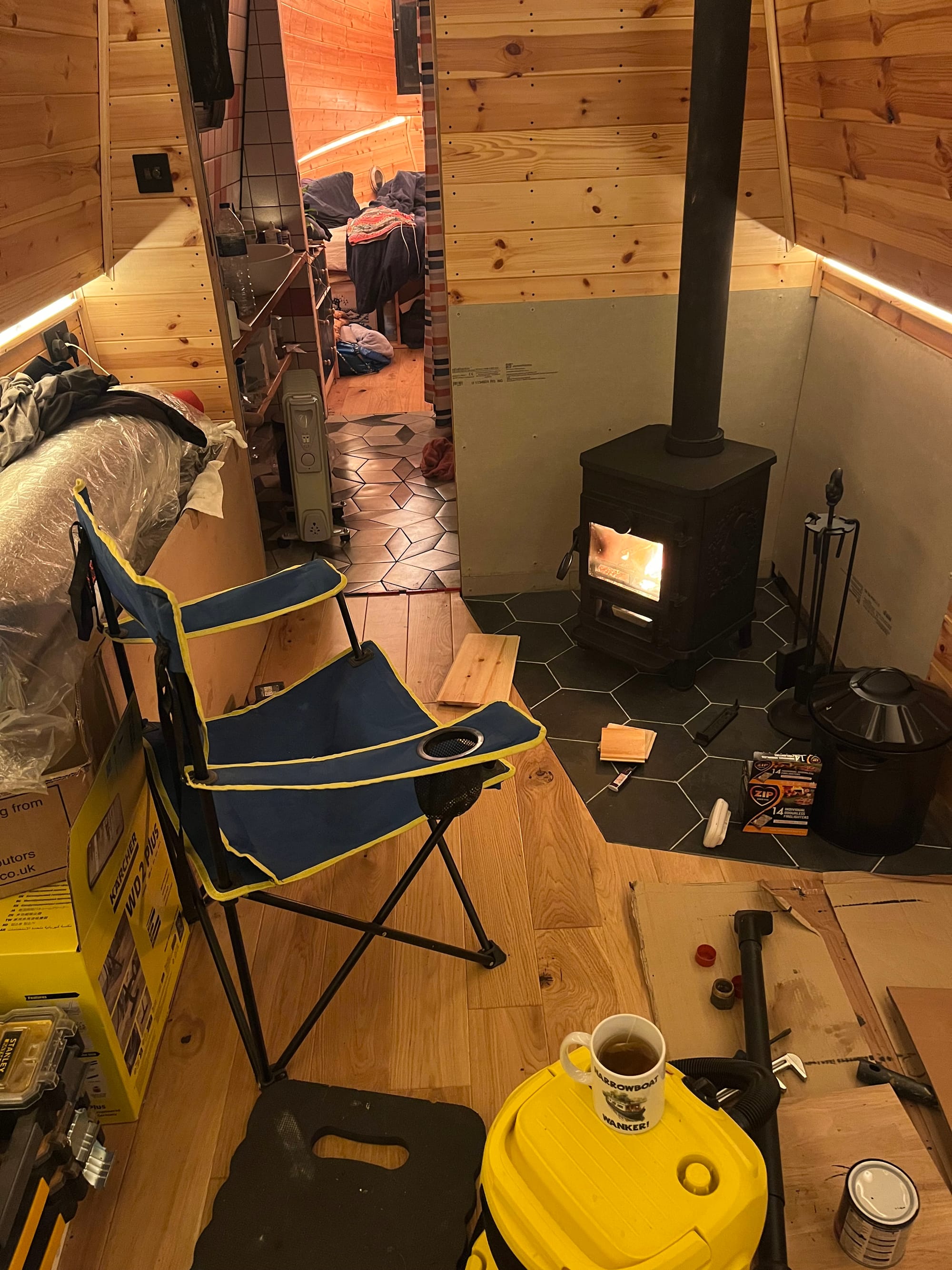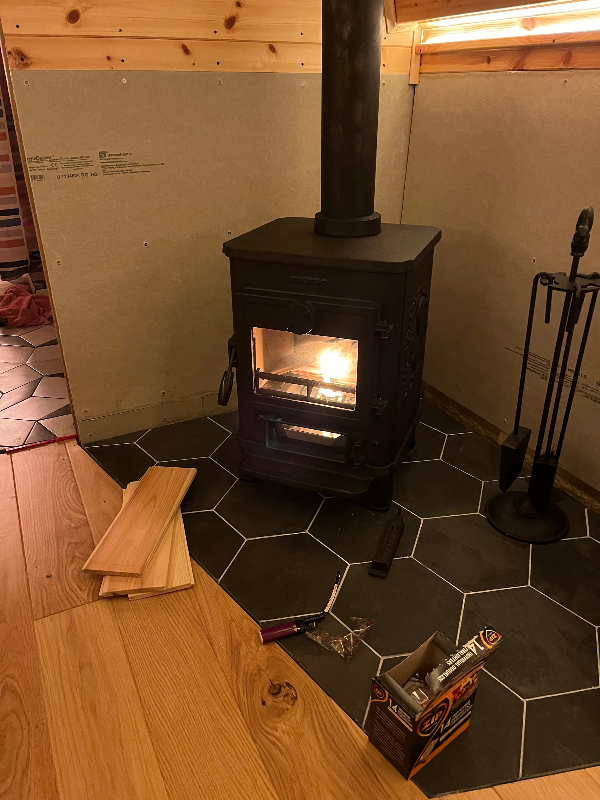 The boat is listing a lot to starboard; it's maybe 100kg of screed + tiles, then another 80kg or so with the stove. I wanted a slight lean for the shower but this is a little too much, and I've run out of heavy things to place on the port side. Maybe a sofa, but the dining table-to-be will counterbalance that. I may slip ~100kg of tractor weights or something under the kitchen units...