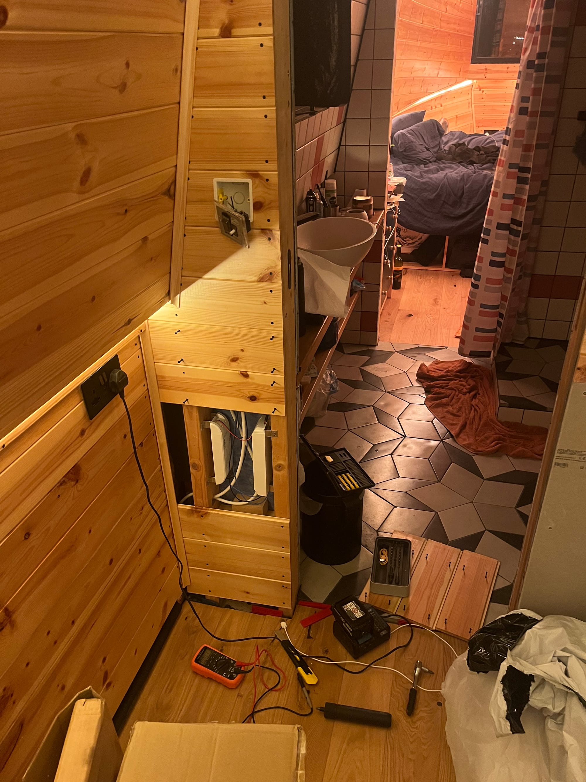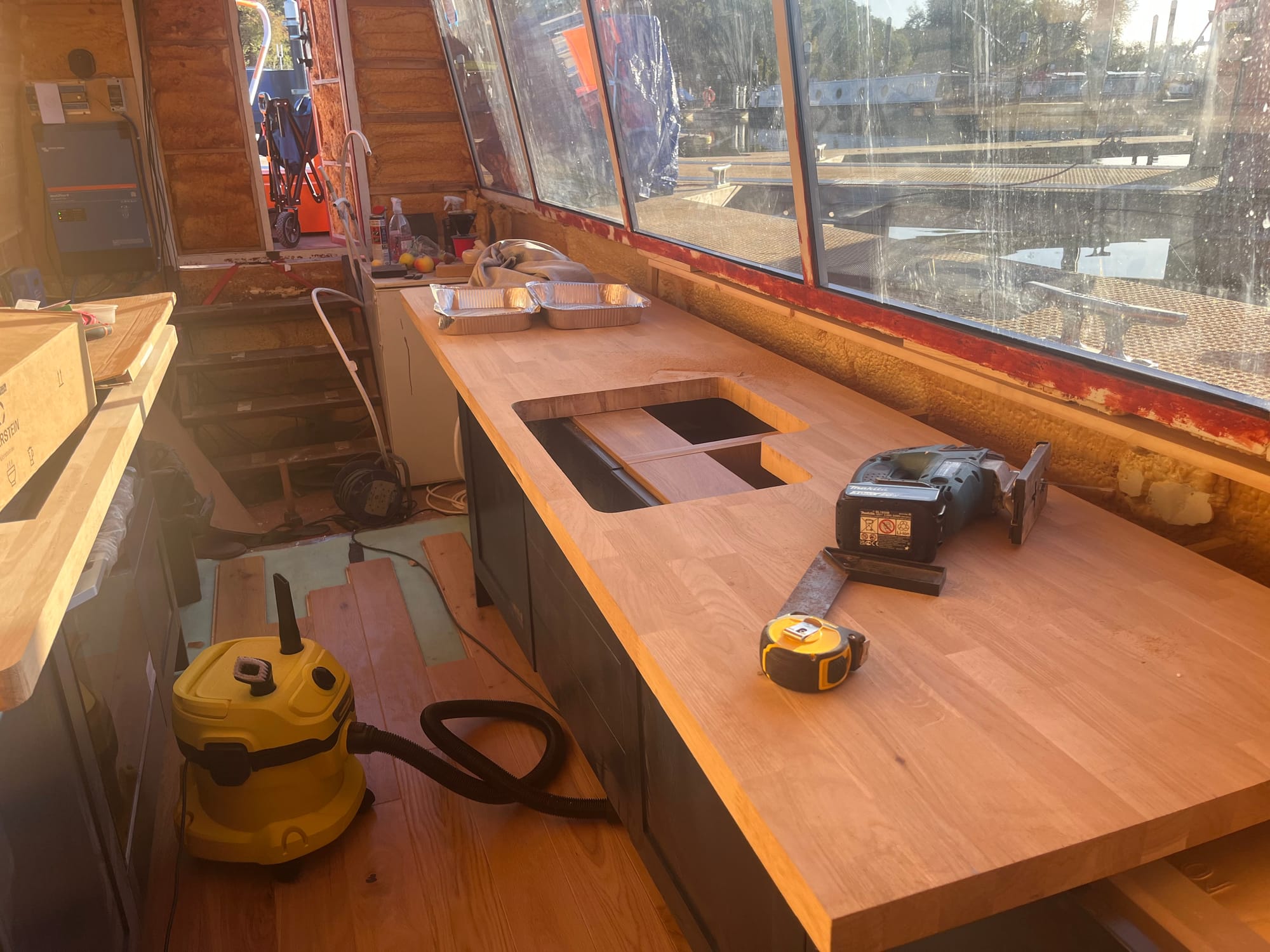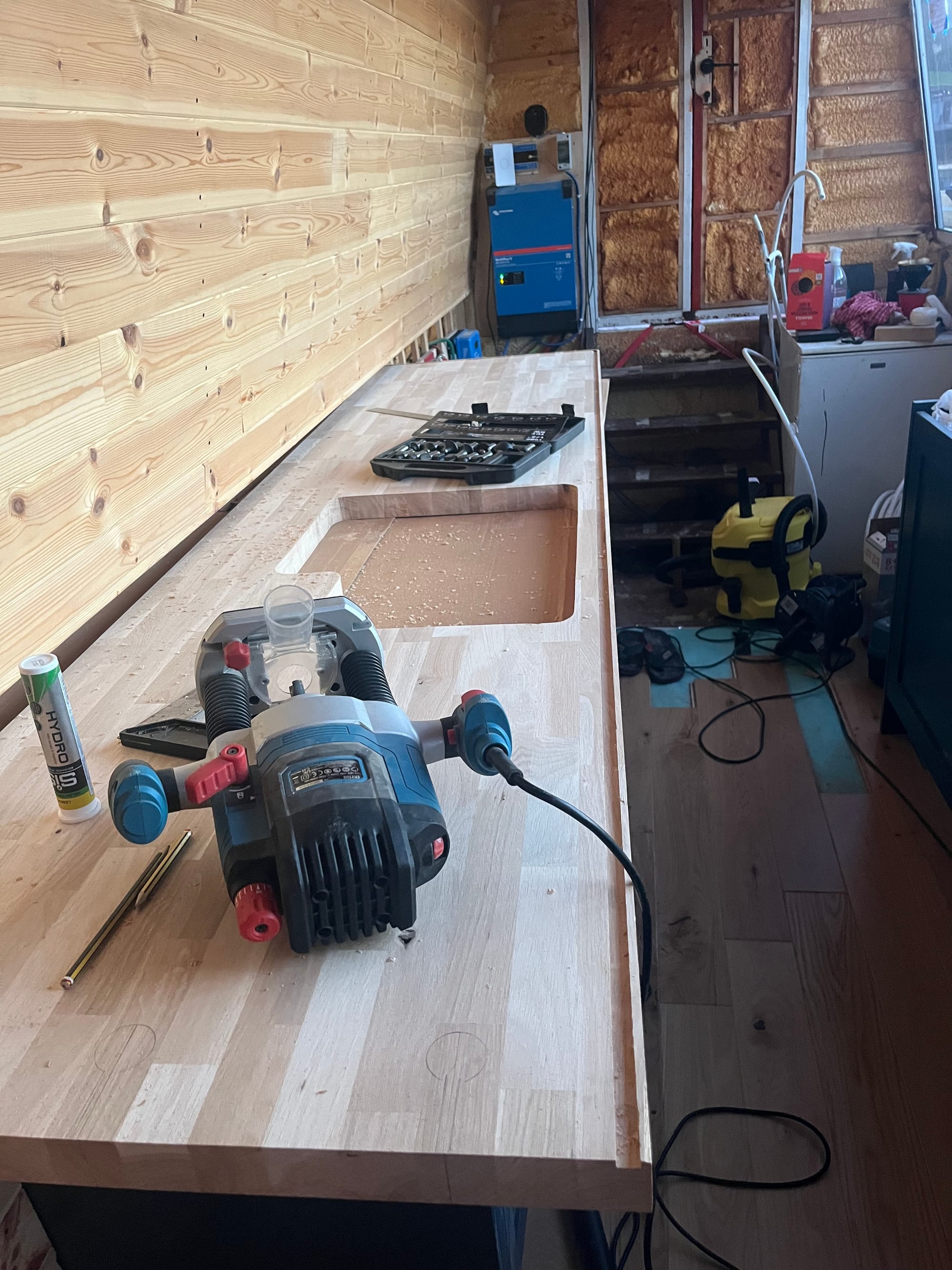 So I had to get some special jigsaw blades for the worktop, for thick hardwood with 2-directional teeth to prevent splintering. But even that didn't stop me from making a mess of the sink cut-out. From a distance it looks fine, but I have a lot of post-production sanding to do...