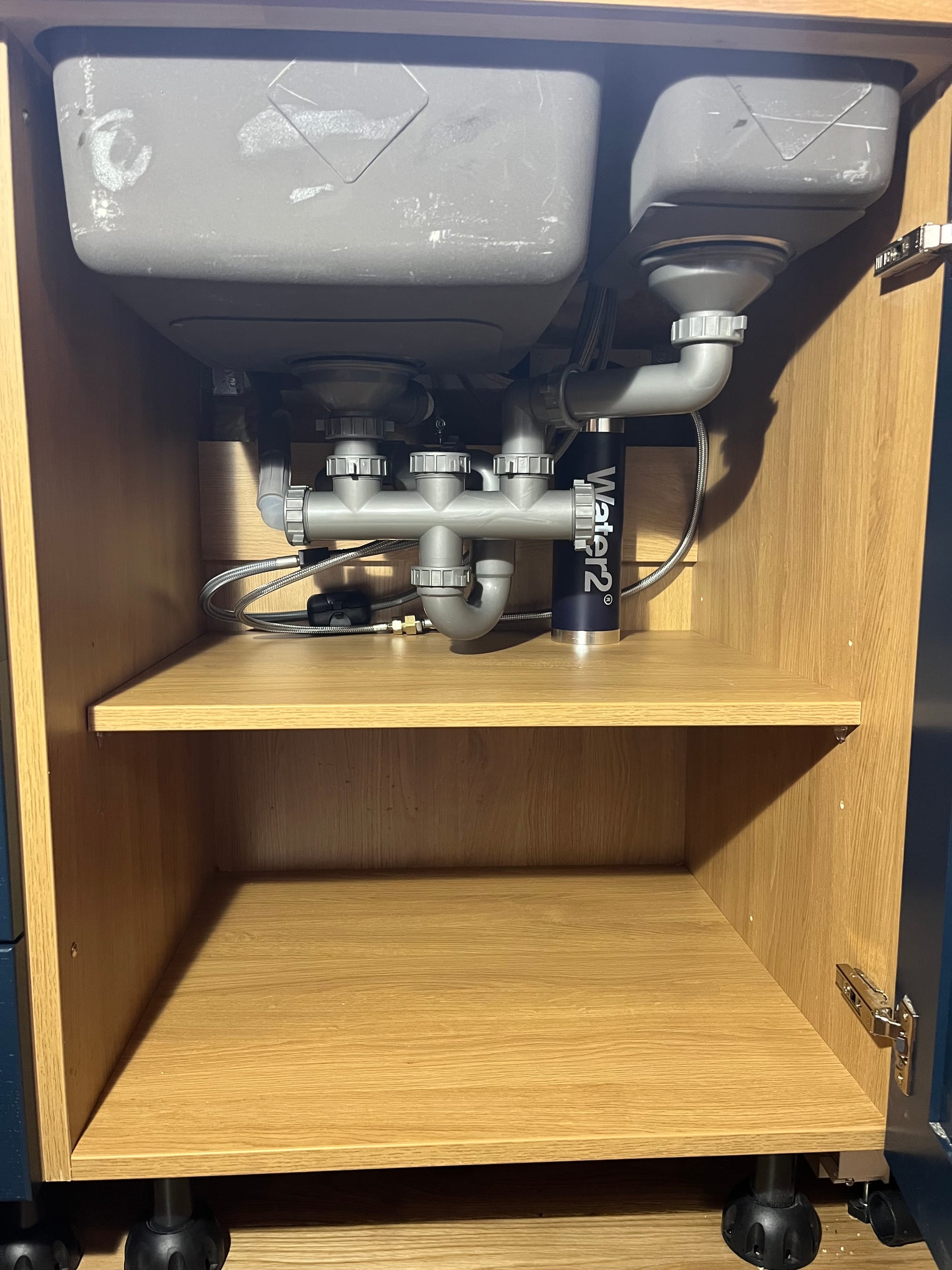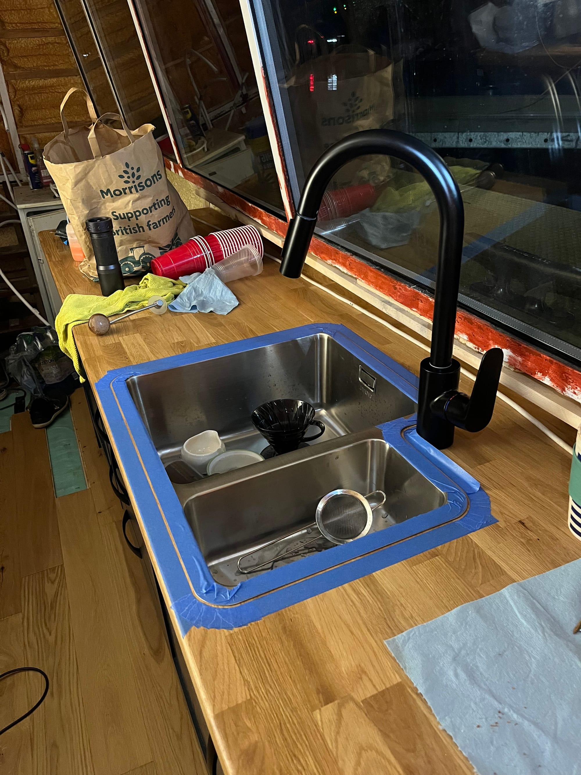 I got back to the boat late on Monday, and the next day was sink plumbing, connecting the tap and an inline water filter. It's a bit of a rube, and the u-bend is strictly unnecessary and the wrong way around, but I need it to reach the exit pipe in the hull: