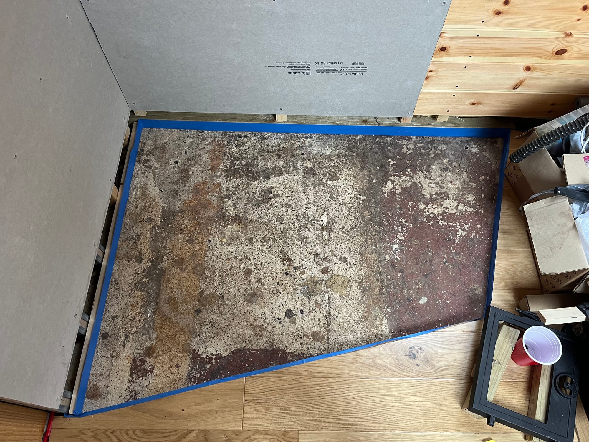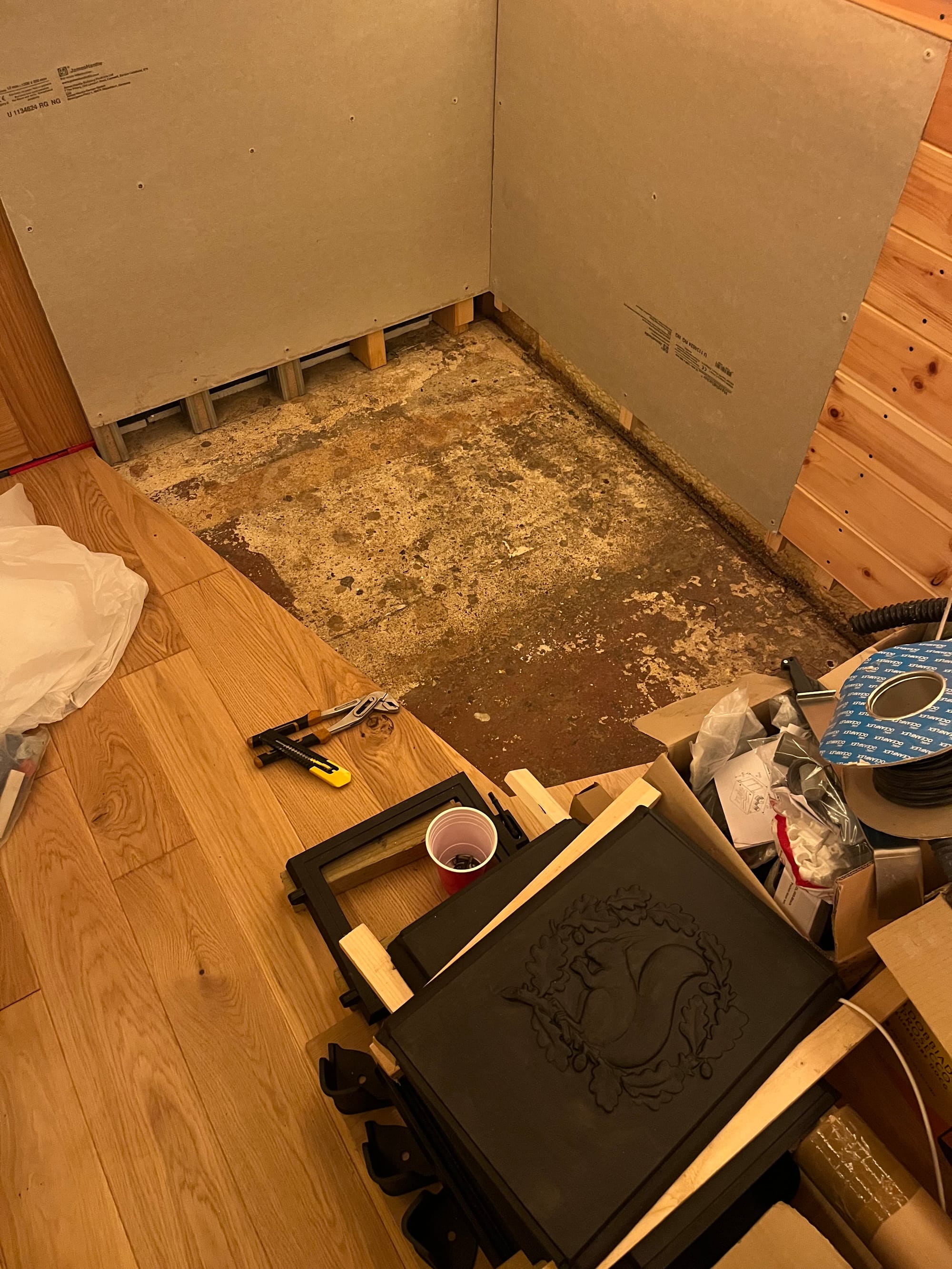 Anyway, before we get to hot food I would like to be warm myself. I've ordered a bunch of components to rebuild the stove, and I started preparing the hearth, first by cutting out the accidental insulation: