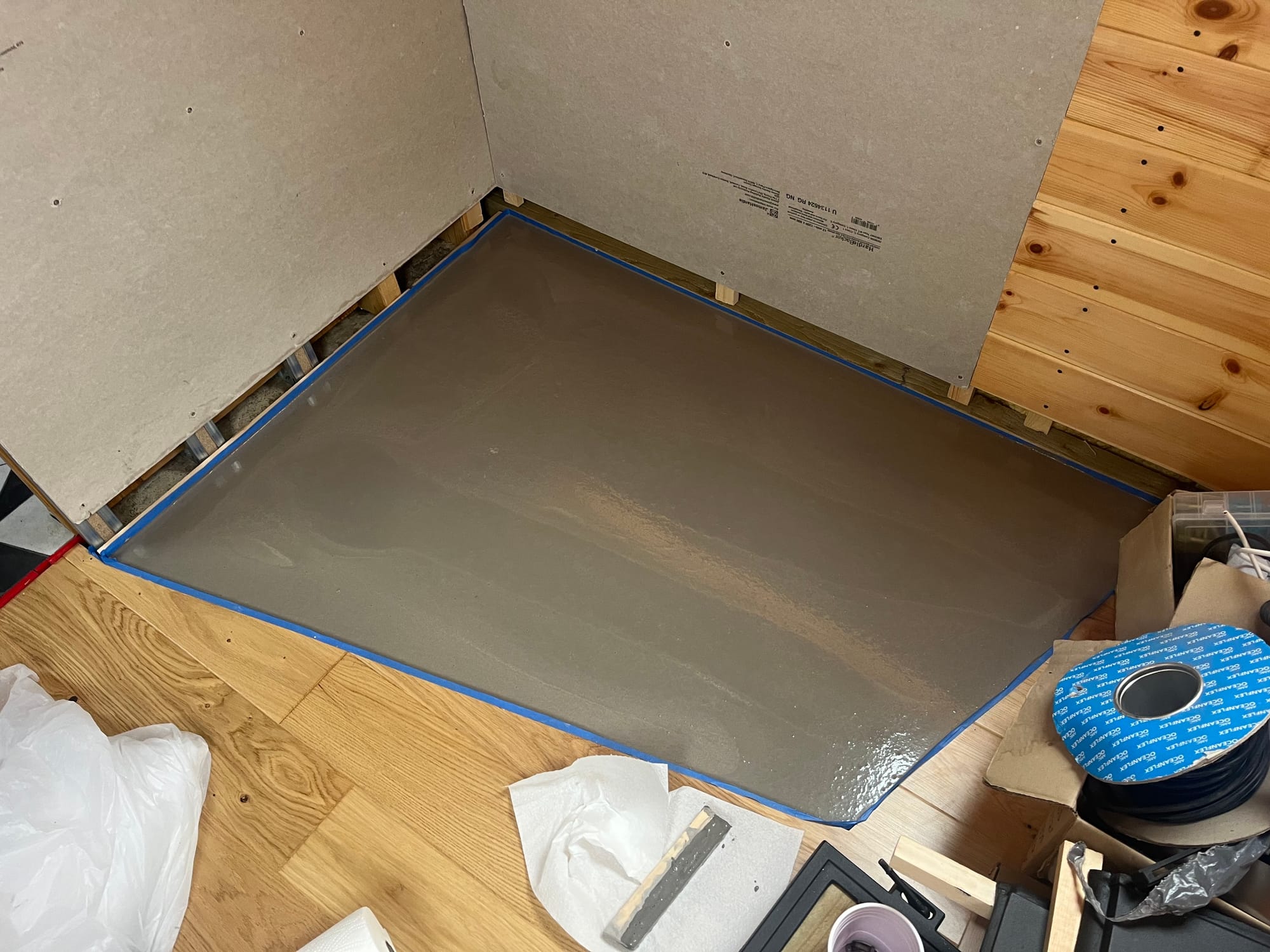 And after filling the water tank to make the boat more level, 3 layers of self-levelling compound (SLC) to raise the floor up for tiling: