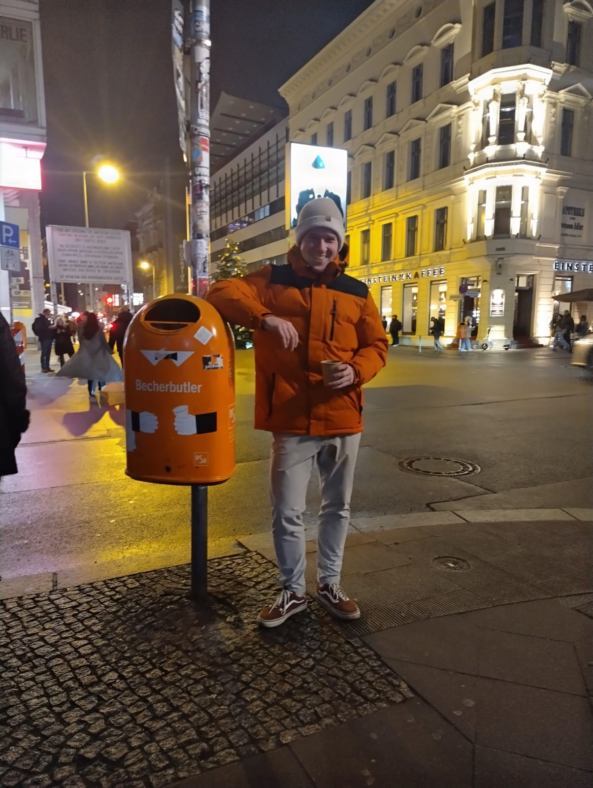 Anyway I got a new winter coat and, besides matching the boat, I also match the bins in Berlin. Here's me at Checkpoint C(harlie):