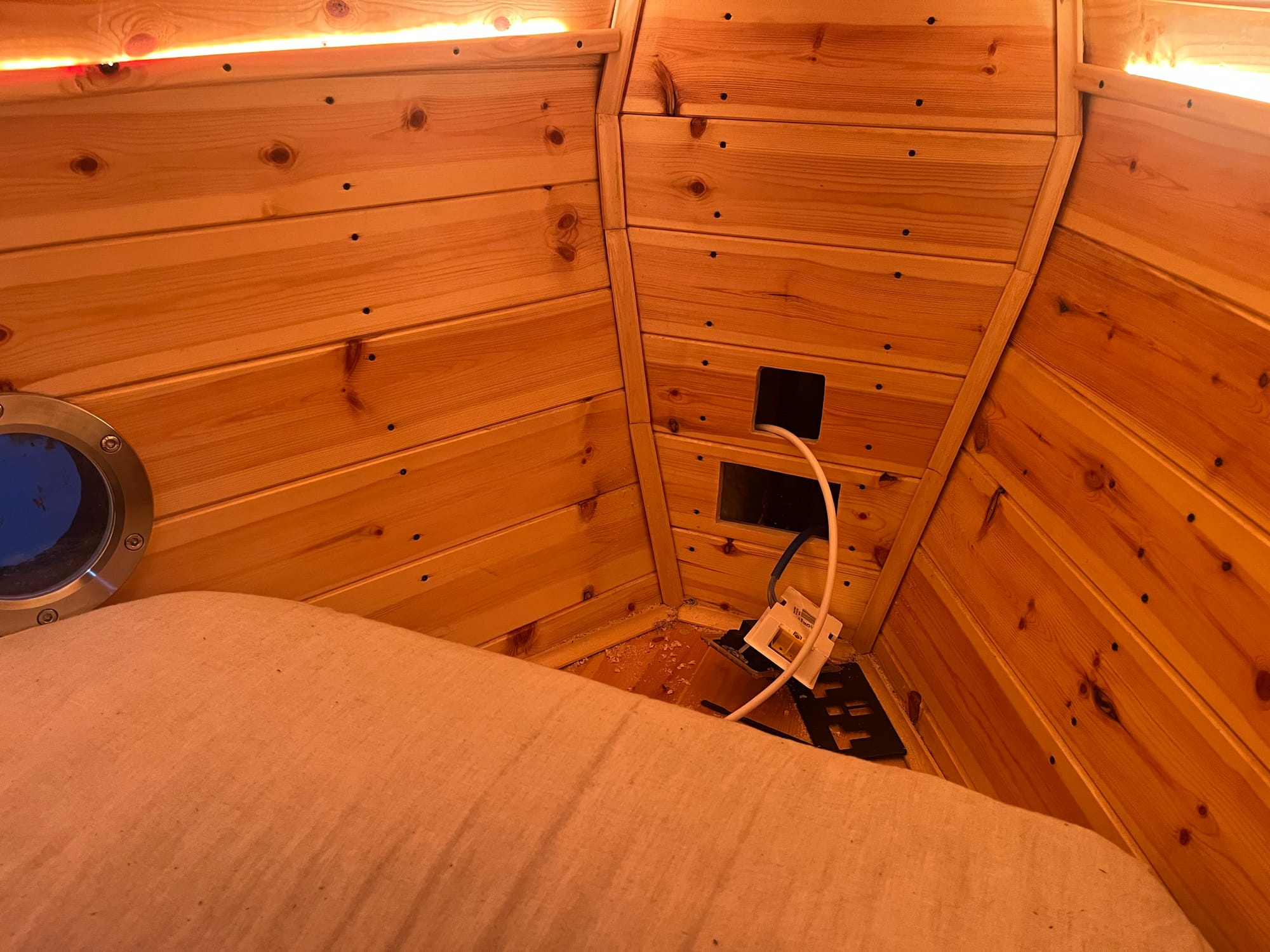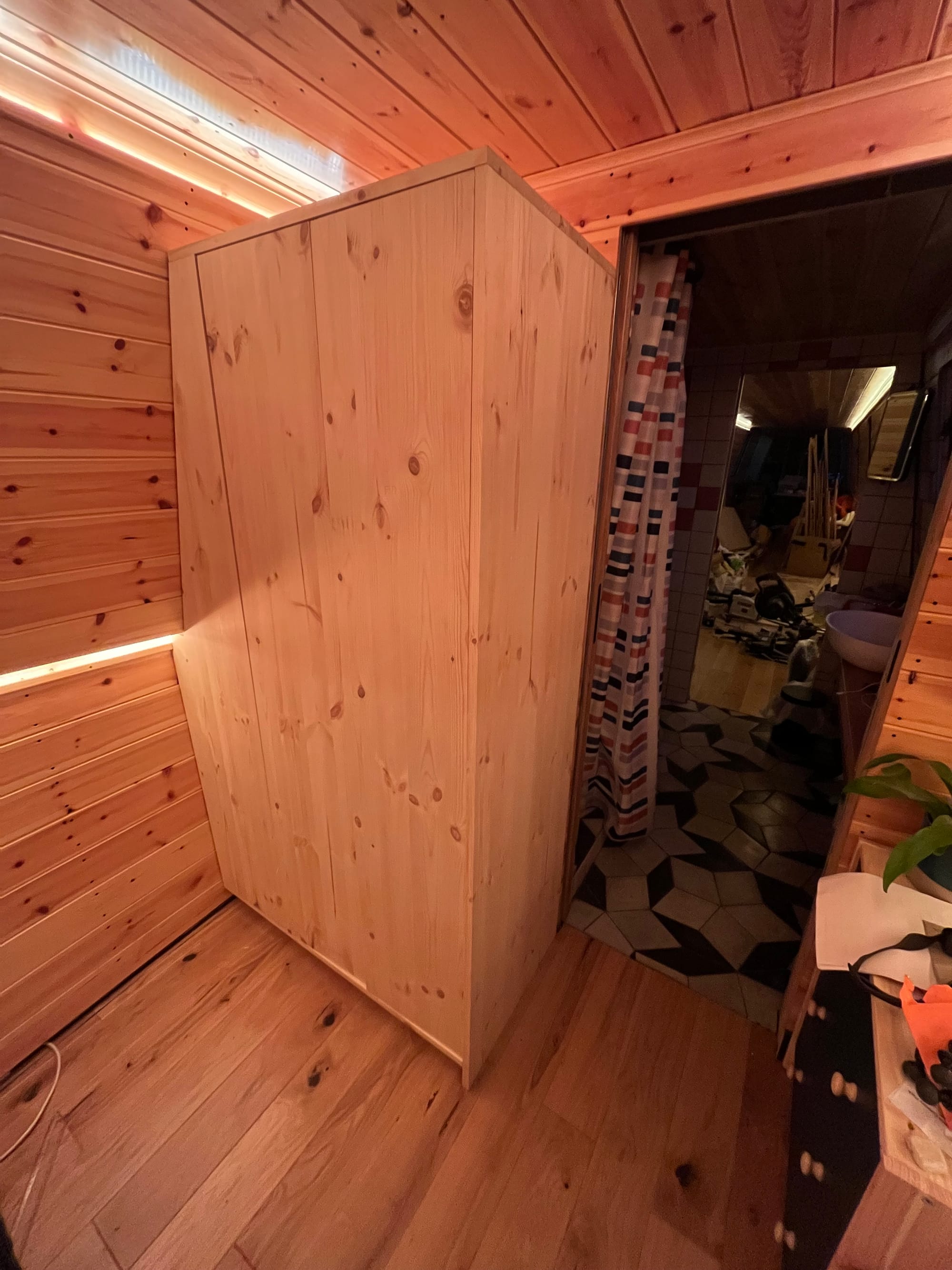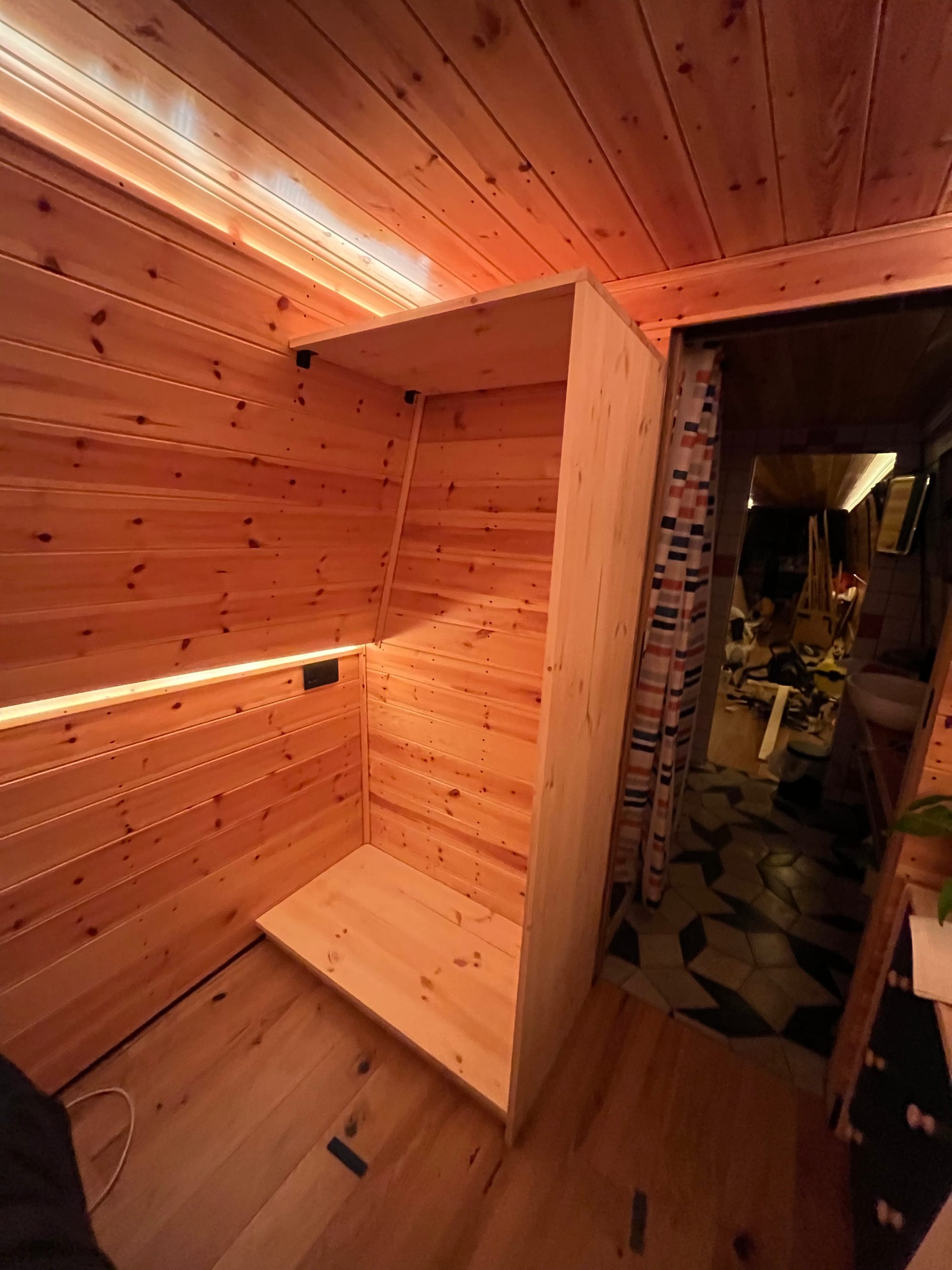 And instead of doing the gas (it was cold, and I don't need it), I've decided to do a final pass from bow to stern, finishing everything along the way. For the bedroom/cabin that's the wardrobe, a blind and door + window trim. And while there I started on another light switch, accessible from the bed: