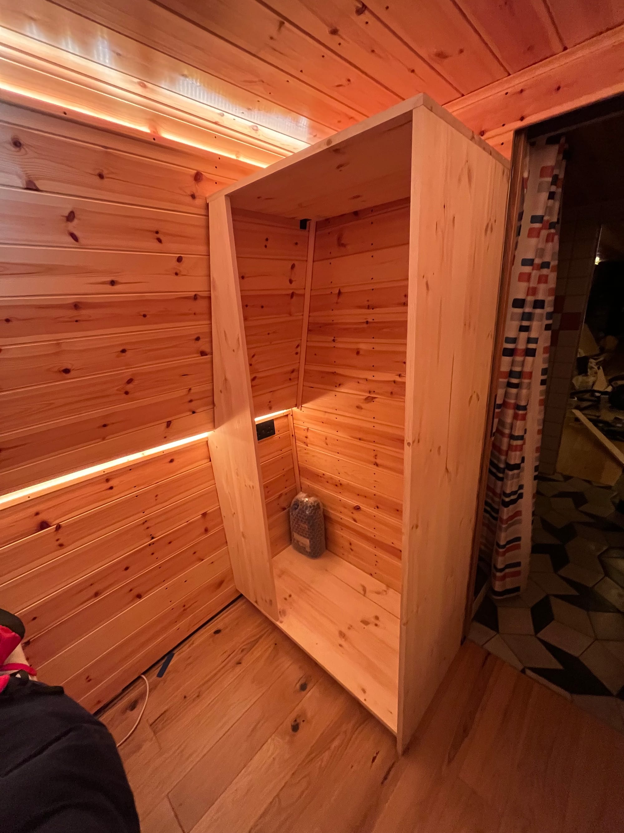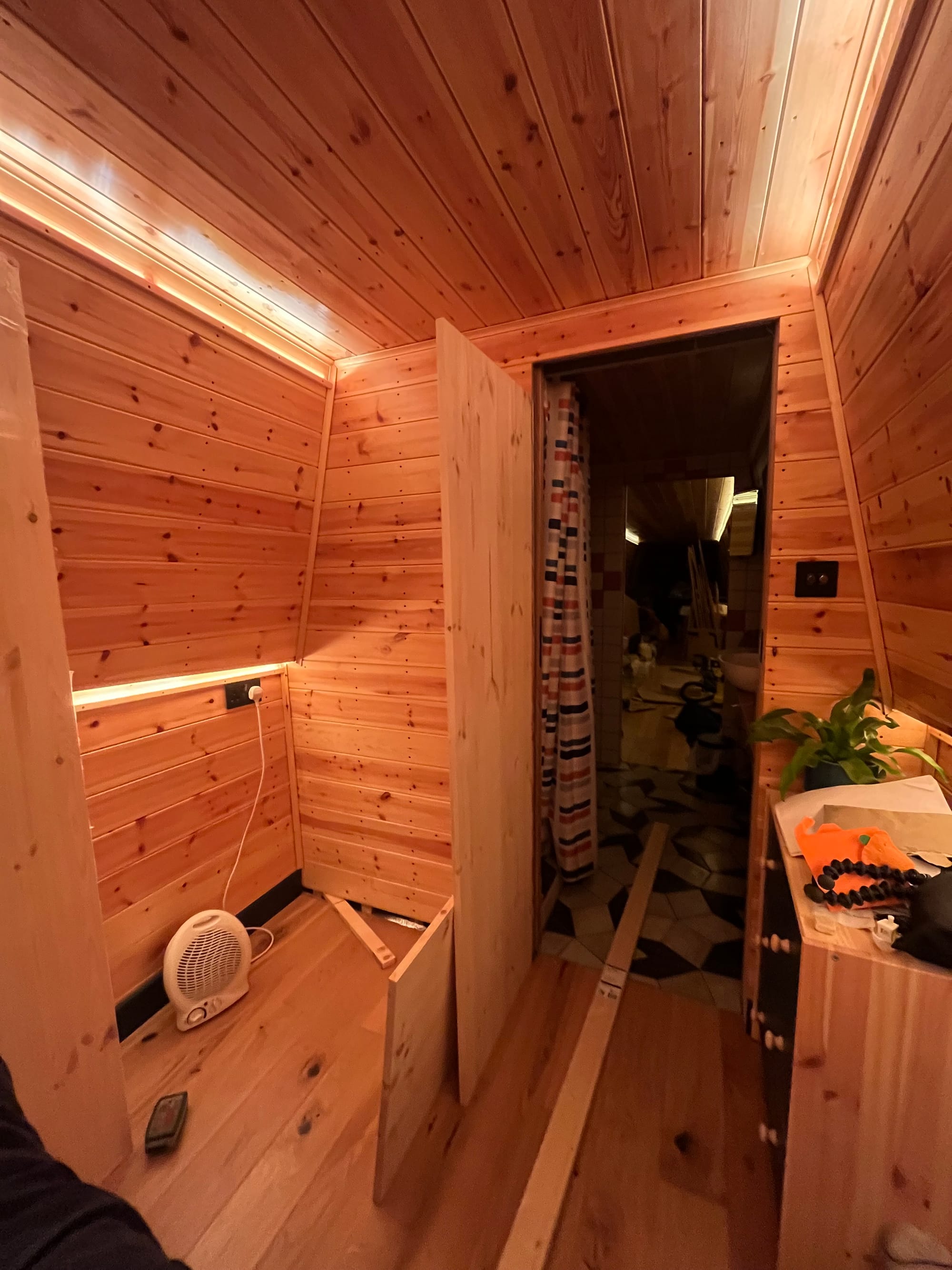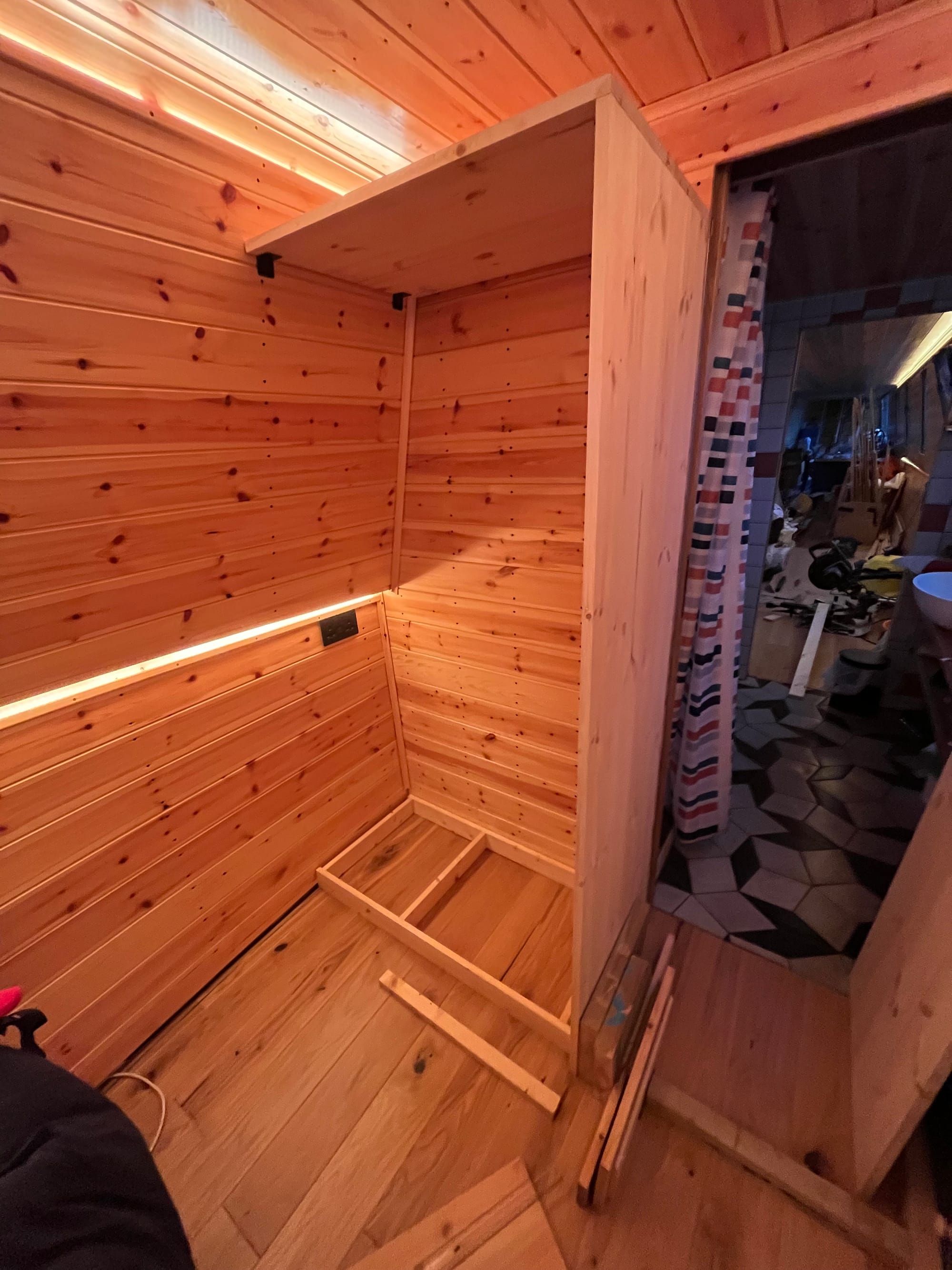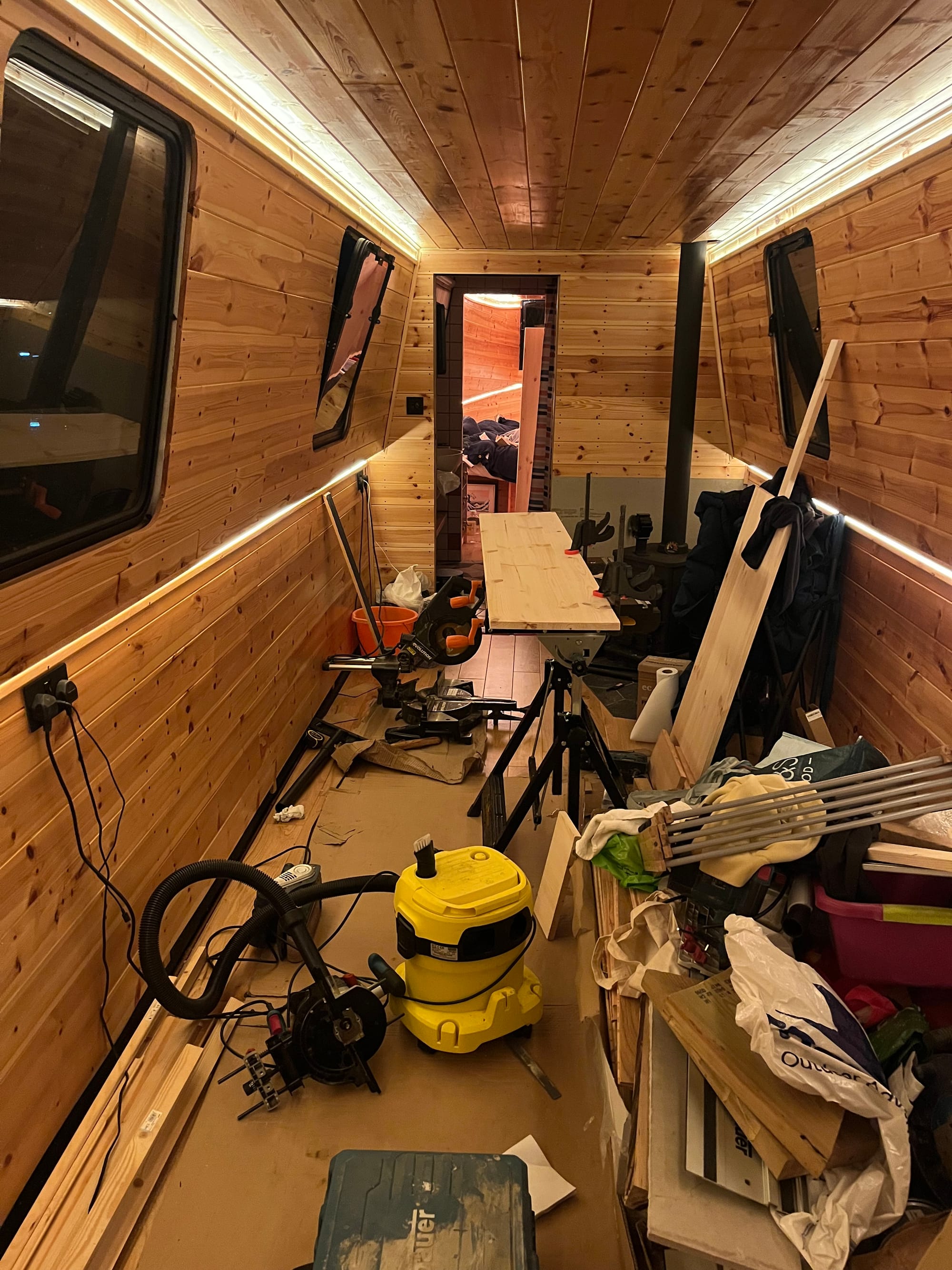 And instead of doing the gas (it was cold, and I don't need it), I've decided to do a final pass from bow to stern, finishing everything along the way. For the bedroom/cabin that's the wardrobe, a blind and door + window trim. And while there I started on another light switch, accessible from the bed:
